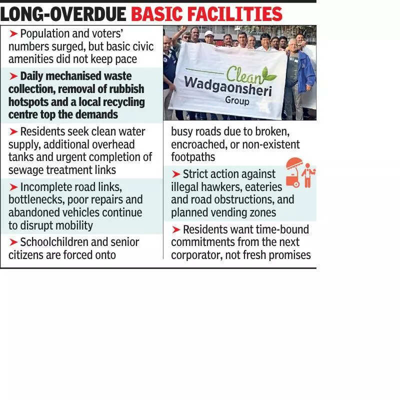 Residents said new housing projects have mushroomed over the past decade, with several more under construction. However, infrastructure and basic amenities failed to keep pace with this growth.The charter highlighted concerns that Wadgaon Sheri did not receive a fair share of development funds when compared to neighbouring areas such as Kalyaninagar, despite its higher population density. The neglect is visible in everyday issues related to cleanliness, water supply, mobility, pedestrian safety and unchecked encroachments, it said.Mira Shah, a member of Clean Wadgaon Sheri Citizens’ Group, who initiated the charter, said the demands were not about luxury projects but long-overdue basic facilities. “Wadgaon Sheri grew rapidly, but civic facilities remained stagnant. This charter reflects what residents face daily and what needs immediate attention,” she said.Cleanliness featured prominently in the demands. Residents sought daily mechanised solid waste collection from all households, removal of feeder points and chronic rubbish spots, proper segregation facilities near schools and public areas, scientific disposal of sanitary and hazardous waste, and the establishment of a local resource recycling centre.The charter called for a regular supply of uncontaminated water at adequate pressure, construction of additional overhead tanks to eliminate dependence on tankers, speedy completion of the Kharadi sewage treatment plant, and proper linkage of drainage lines to treatment facilities to prevent untreated sewage from entering the river.Traffic congestion, unsafe roads and poor public transport made daily commuting difficult. Residents demanded completion of long-pending road links to Kalyaningar, widening of bottleneck stretches, construction of a proper roundabout at key intersections, full-length road repairs as per norms, better pedestrian crossings near schools, improved bus services and removal of abandoned vehicles.Rajan Batra, who was involved in the initiative, said the surge in voters changed the political importance of the ward. “With such a large and diverse electorate, candidates can no longer ignore Wadgaon Sheri’s problems and expect support,” he said.Another resident, Shyamal Basu, said the charter was meant to ensure accountability after the PMC election. “We want clear commitments from whoever gets elected, and we intend to follow up until these basic issues are resolved,” he said.The document also stressed the need for walkable footpaths, free from encroachments, hanging cables and overgrown branches, particularly on routes used by schoolchildren and senior citizens. Finally, people sought strict action against illegal hawkers and eateries, alongside the creation of a planned hawkers’ zone with basic facilities.By placing their collective demands before all candidates, Wadgaon Sheri’s residents signalled that development and governance would be central issues this election.The charter was prepared based on reports and letters by the residents, including Ateesh Agarwal, Surendra Agarwal, Raman Bohra, Pankaj Joshi, Prakash Kadam, Anil Melwani, Vinod Sharma and Aba Shetye.