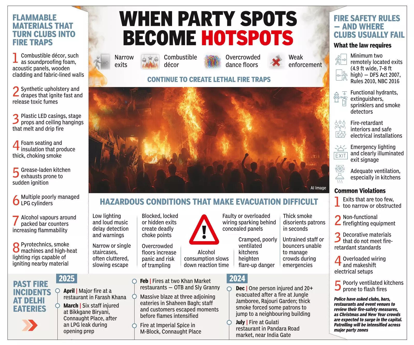 NEW DELHI: The Goa nightclub blaze that killed at least 25 people on Sunday has renewed scrutiny of fire safety measures at entertainment venues across the country, including Delhi, where officials say lax compliance, crowded interiors and neglected safety systems continue to leave thousands at risk.A senior additional divisional officer of Delhi Fire Services said the safety framework for nightclubs and bars is already well-defined. It draws from the Delhi Fire Services Act, 2007, its 2010 rules, the National Building Code, 2016, and the Unified Building Bye-laws. “In theory,” he said, “every club is supposed to comply with all of these.”Another officer explained that the basics are routinely overlooked. He said DFS checks firefighting arrangements, exit provisions, prevention and protection measures, and whether all firefighting equipment are functioning before issuing a safety certificate, which is valid for three years. But the gap, he added, begins with the layout. Clubs are required to have at least two entry and exit points at the remotest ends of the premises, “but this is hardly followed anywhere.“He said the cramped designs are often dangerous. Narrow staircases should never be part of a public assembly building. Exit routes must be at least 1.5 metres wide with a clear height of 7-8 feet. Fire hydrants and extinguishers must not only be installed but also work. Eateries that serve alcohol, he said, require stricter standards because liquor is highly flammable. If the interiors are fitted with materials that are not fire-retardant, it “becomes a recipe for disaster.”“Clubs often claim they have multiple entry and exit points, but one of them is usually treated like a service entry for staff. This is often blocked,” station officer Nitin said, describing a hazardous firefighting operation about three years ago at M-Block in Connaught Place.“Most clubs don’t have a separate kitchen. It is right next to the main dining space and they use LPG cylinders. Two years ago, I remember being on the second floor and there were so many cylinders. One exploded within minutes. The blast shook the concrete roof slab, and before we could stabilise anything, another cylinder went off. The whole platform felt like it had lifted,” he said. Electrical hazards and poor upkeep inside kitchens add to the problem. Former Delhi Fire Services chief Atul Garg said: “One of the most critical challenges in nightclubs and discos is that, even when the fire alarm system and all firefighting installations are fully functional, the environment itself prevents timely recognition of an emergency. High ambient noise from music, combined with strobe lights, laser effects, smoke machines and crowd density, muffle the sound of traditional fire alarm signals.” People inside the building often fail to perceive the alarm, and this gap is one of the major life-safety vulnerabilities in nightclubs and discos. It requires specialised solutions beyond standard alarm systems to ensure rapid occupant response, Garg said.Another fire officer said that the wiring is often substandard and housekeeping in many bar and club kitchens is “very bad,” with no ventilation and storage piled to the brim. “Many establishments operate in extremely dark, cramped spaces. At least during the day one can see where to go,” a senior fire officer said. “But these clubs are so dimly lit that nobody will understand where the exit is. Once there is smoke, visibility drops to zero.“Sandeep Anand Goyle, the Delhi chapter head of the National Restaurants Association of India, explained how NRAI only engages with establishments that have valid fire NOCs. “Whenever a restaurant seeks membership, these documents are mandatory to be submitted. There is a clear system of checks and balances. We review their trade licences and NOCs, and a trade licence itself cannot be issued without a fire NOC. Similarly a liquor license cannot be issued without a trade license. And if the establishment is 90 square metres and above the fire NOC becomes mandatory.”
