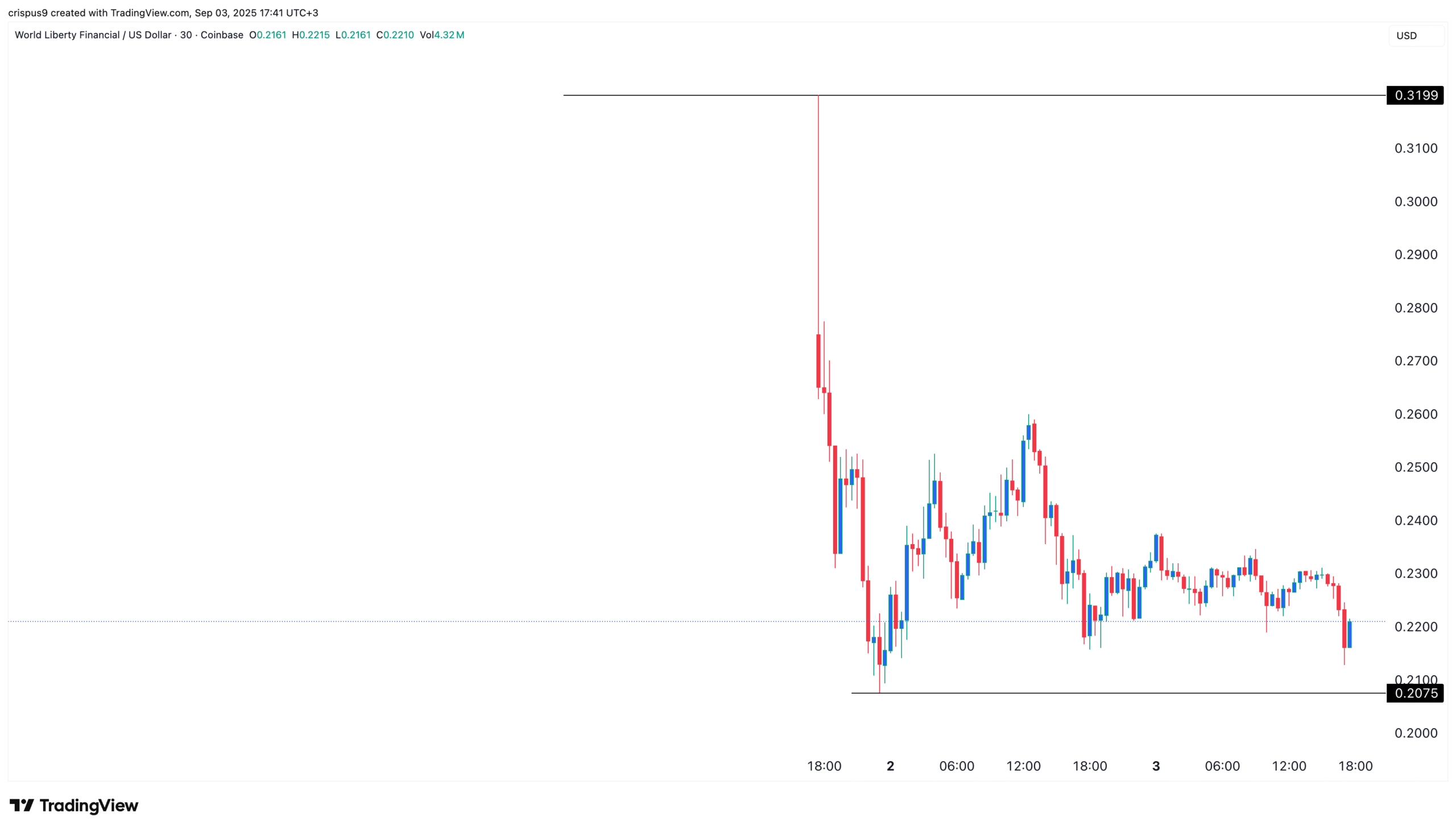 The 30-minute chart shows that the WLFI price has slumped from $0.32 on Monday to $0.2160. It has formed a bearish flag pattern, which often leads to more downside.