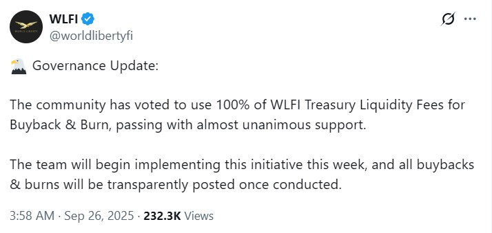 Still, the team also clarified that only fees from WLFI-controlled liquidity are included in the burning mechanism. The project said that community or third-party liquidity pools are not affected.