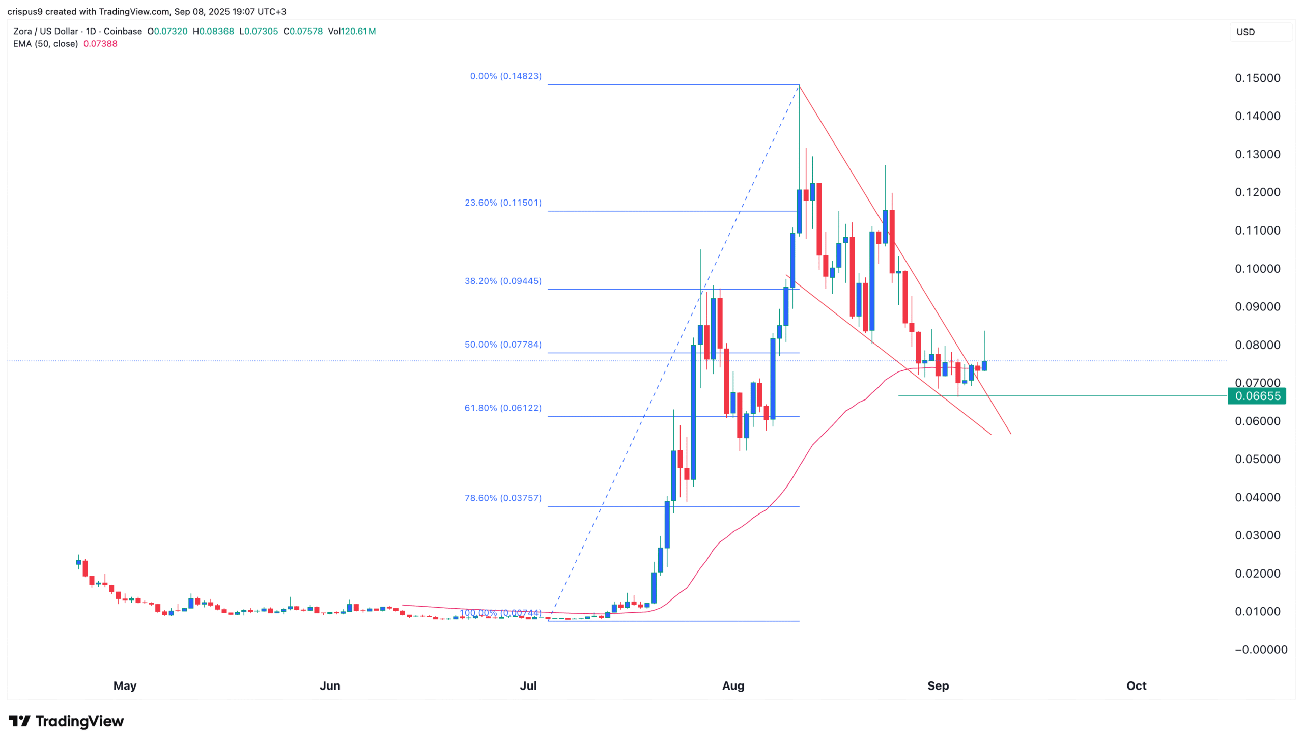 The daily timeframe shows that the Zora crypto price jumped from a low of $0.00725 in July to the current $0.07800. The current price is along the 50% Fibonacci Retracement level.